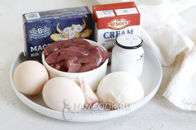 Соберите все продукты по списку и приступим к приготовлению муссового паштета из куриной печени.