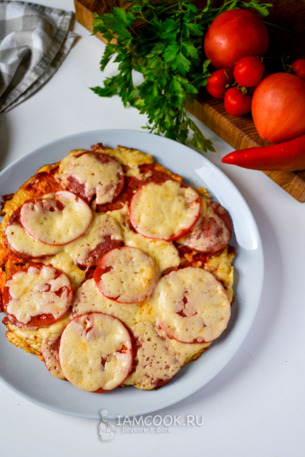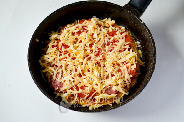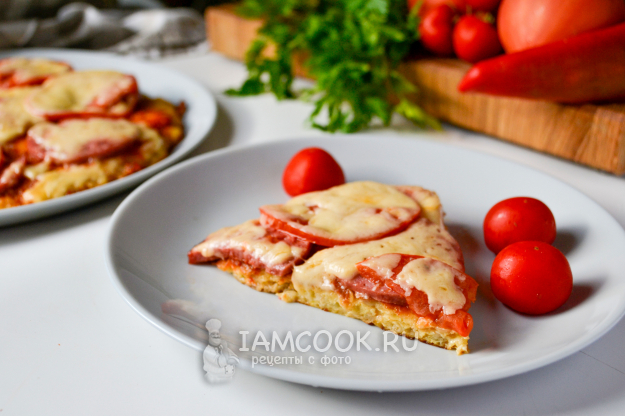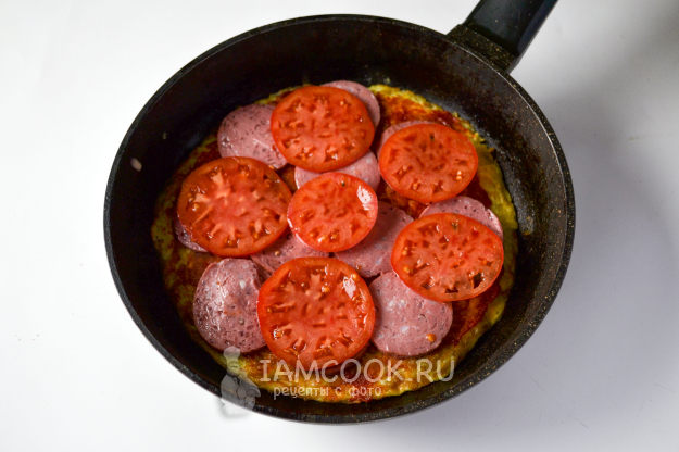 Пока основа готовится, нарежьте тонкими кружочками помидоры, колбасу.