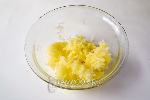 Кабачок очистите от кожуры и семечек. Если овощ молоденький, то можно использовать целиком. Натрите на крупной теке, чуть посолите и оставьте на 10 минут, чтобы дал сок.