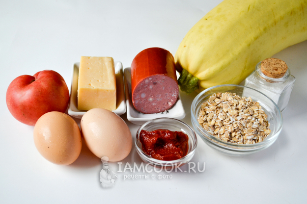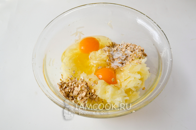 Затем хорошо отожмите кабачок от сока. Разбейте в миску яйца, всыпьте овсяные хлопья. Я использую хлопья длительной варки. Немного посолите.