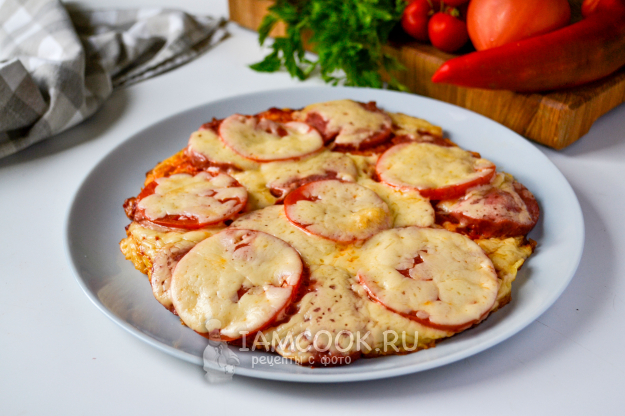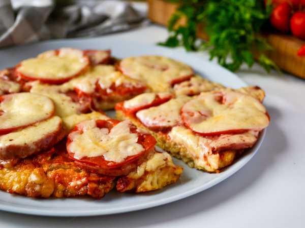 Накройте сковороду крышкой и продолжайте готовить пиццу из кабачков без муки на тихом огне до румяной нижней корочки.