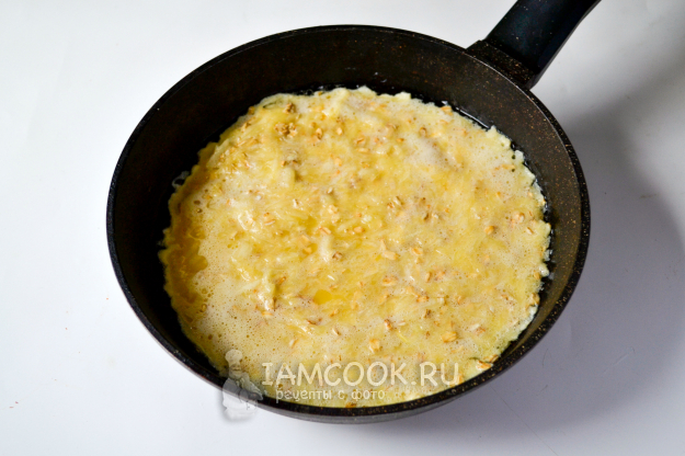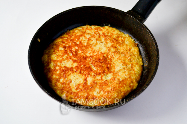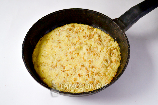 Когда нижняя сторона хорошо подрумянится, а верхняя перестанет быть жидкой, аккуратно переверните основу при помощи широкой лопатки на другую сторону.