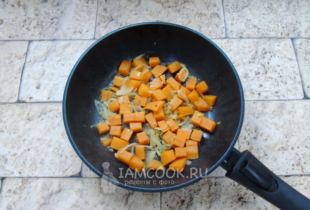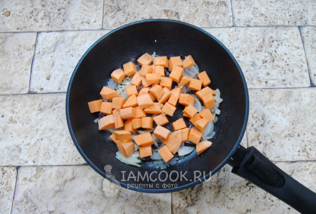 Батат очистите, помойте и нарежьте кубиками. Добавьте в сковороду к луку и чесноку.