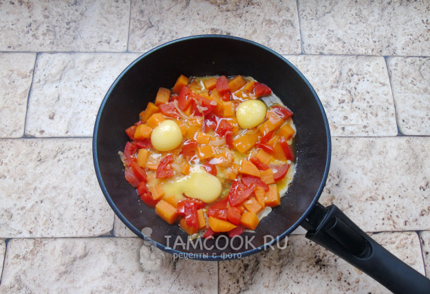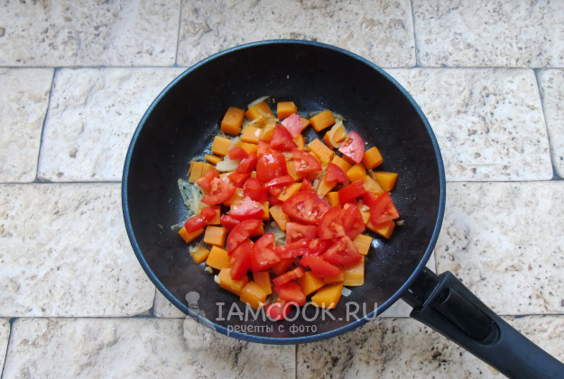 Помидоры нарежьте кубиками и добавьте в сковороду. Посолите по вкусу и жарьте еще 5-6 минут.