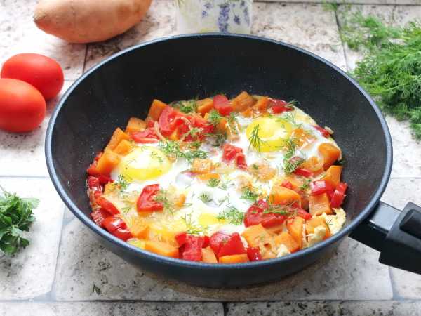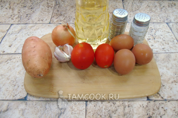 Подготовьте ингредиенты для приготовления яиц с бататом на сковороде.