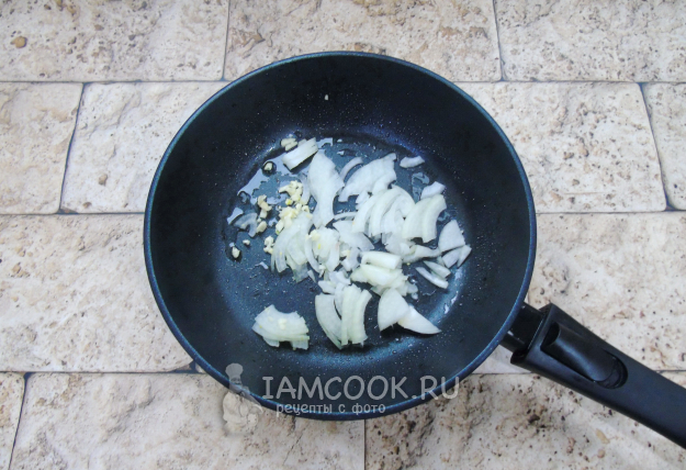 Лук и чеснок очистите, помойте. Лук нарежьте полукольцами, а чеснок мелко. Выложите на сковороду с растительным маслом.