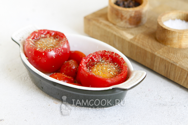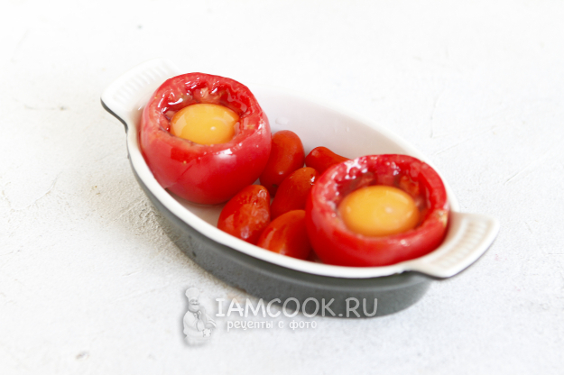 Подготовьте подходящую форму для запекания. Для устойчивости можно срезанные шляпки положить в форму, а на них установить помидоры. Либо как в моем случае, между помидорами выложить маленькие помидорки черри. Разбейте яйца и влейте их в помидоры.