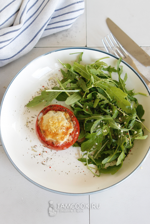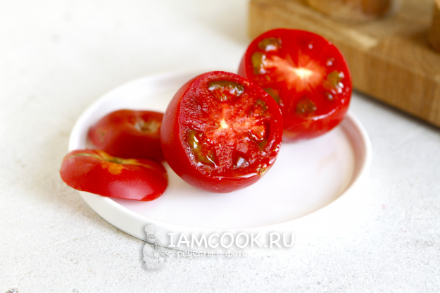Помидоры должны быть свежими, плотными и желательно с толстой кожурой. Такие помидоры при запекании лучше сохраняют форму. Промойте их, обсушите и срежьте у них шляпку.