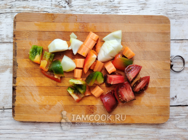 С остальными овощами поступить так же, нарезать их можно хаотично, главное, не очень крупно, чтобы они быстрее стали мягкими при запекании в духовке.