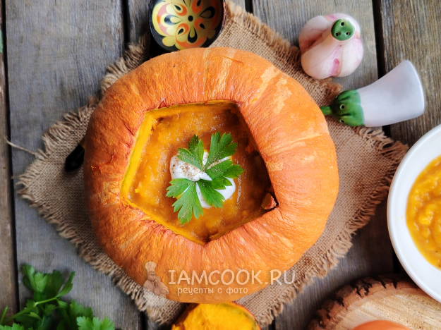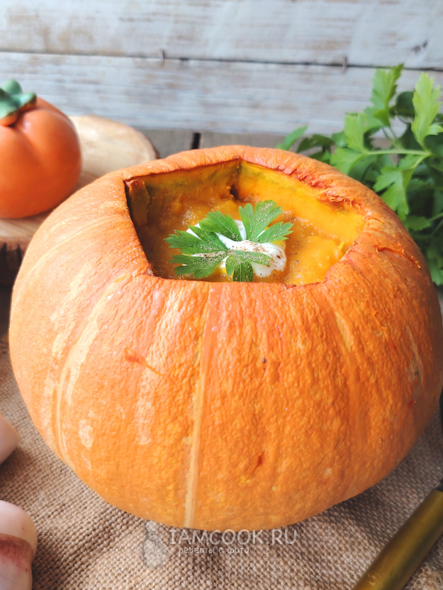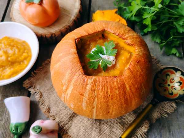 Подать тыквенный суп к столу в тыкве. Можно разлить его по чашкам, а потом сам горшочек разрезать на кусочки и подать с супом. Приятного аппетита!