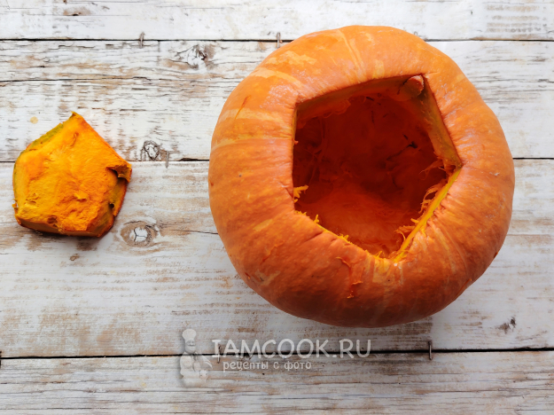 Параллельно подготовить тыкву для горшочка: помыть, аккуратно срезать верхушку, ложкой удалить мякоть. Смазать ее изнутри маслом и отправить в духовку вместе с овощами, которые запекались для супа, также на 25 минут.