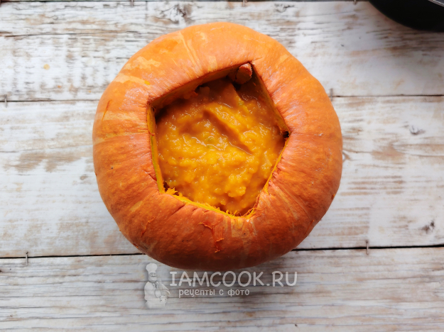 Наполнить тыкву супом и закрыть "крышкой". Поставить тыквенный суп-пюре в тыкве в духовку еще раз, на 20 минут. Сама тыква должна стать мягче и пропитаться вкусом супа.