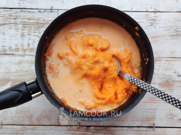 Варить суп-пюре на среднем огне в течение 10 минут с момента закипания смеси. Он должен немного загустеть.