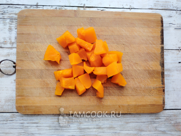 Одну тыкву помыть, почистить, убрать семена. Мякоть нарезать кубиками.