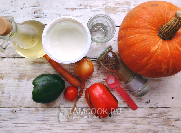 Собрать по списку необходимые продукты для приготовления тыквенного супа-пюре в духовке (в тыкве). Для данного блюда потребуется две тыквы: одна целая и небольшого размера, от второй можно взять лишь часть.