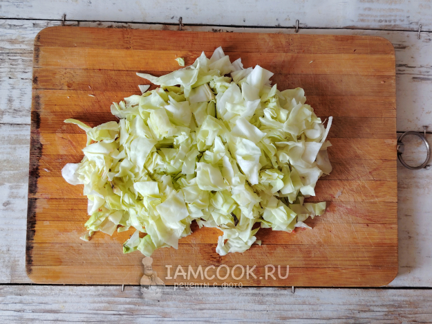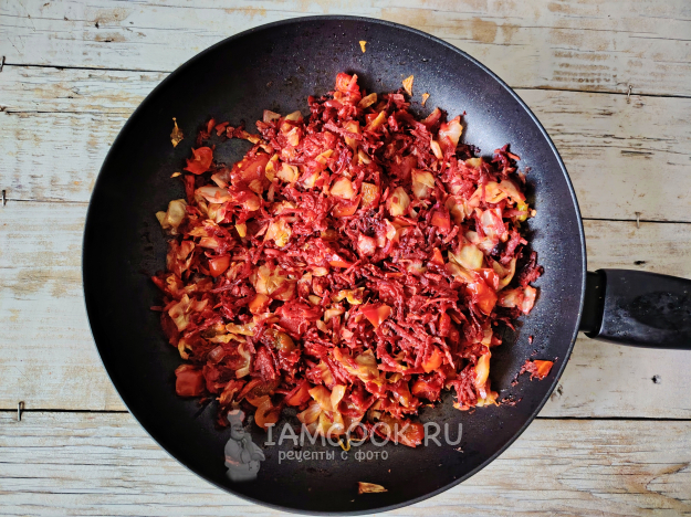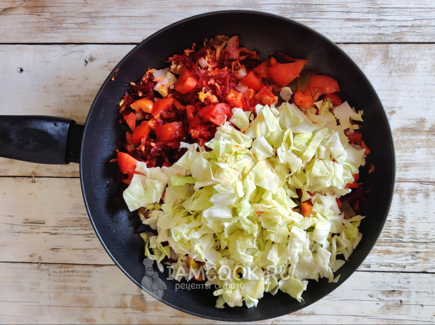 Следом добавить капусту. Дать капусте обжариться с остальными овощами в течение 7 минут, чтобы она стала мягкой. Затем влить воду, убавить огонь до среднего и тушить массу под крышкой в течение получаса.