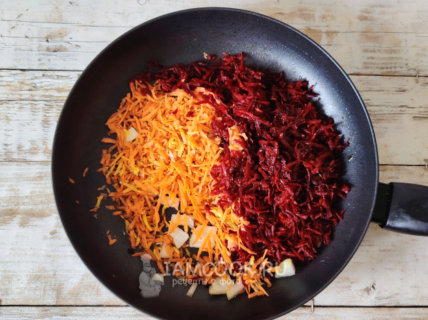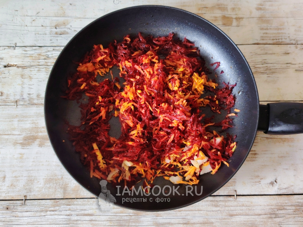 На сковороде разогреть масло. Выложить на масло подготовленные овощи. Главное, выкладывать их на хорошо прогретое масло, чтобы овощная стружка не впитала в себя излишки жира. Тушить овощи около 10 минут.