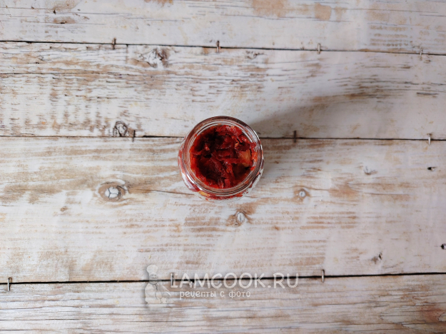 Наполнить горячей овощной массой стерильные баночки. Баночки лучше взять небольшого объема, чтобы после вскрытия использовать сразу целую емкость для приготовления борща.