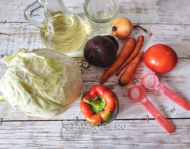 Собрать по списку овощи для приготовления борща на зиму с помидорами и капустой.