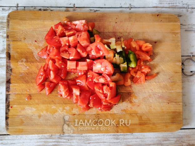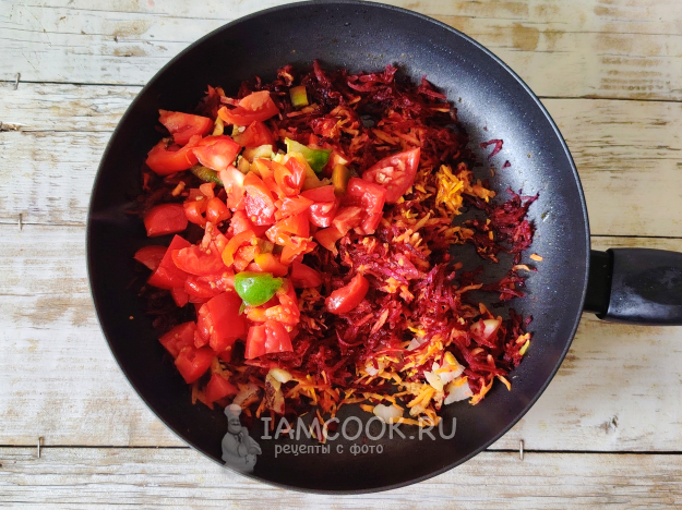 Отправить томаты в сковороду. Можно помидоры измельчить при помощи блендера в однородную массу и добавить в овощную массу последней.