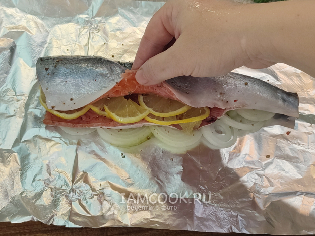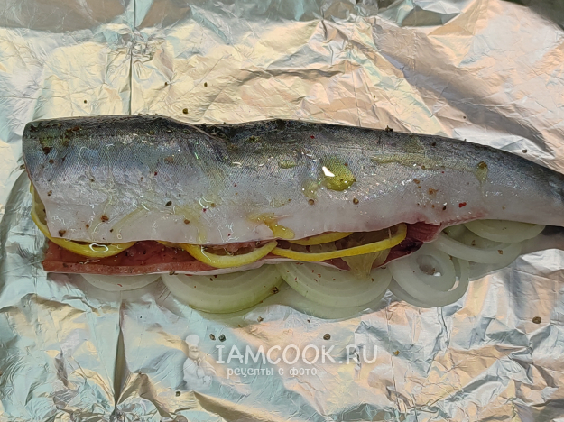 На лук уложите приправленную рыбу. Лимон нарежьте тонкими кружочками, кружочки разрежьте на полукольца, чтобы они полностью поместились в брюшко гольца.