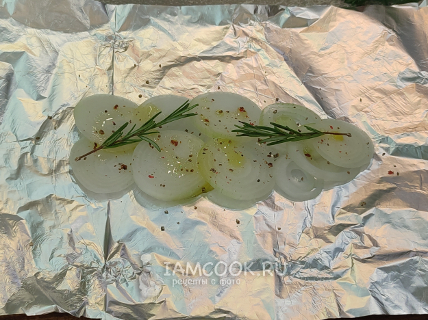 На фольгу уложите ломтики лука, сбрызните оливковым маслом, приправьте солью, перцем, положите пару веточек розмарина, много не нужно, двух маленьких будет достаточно.