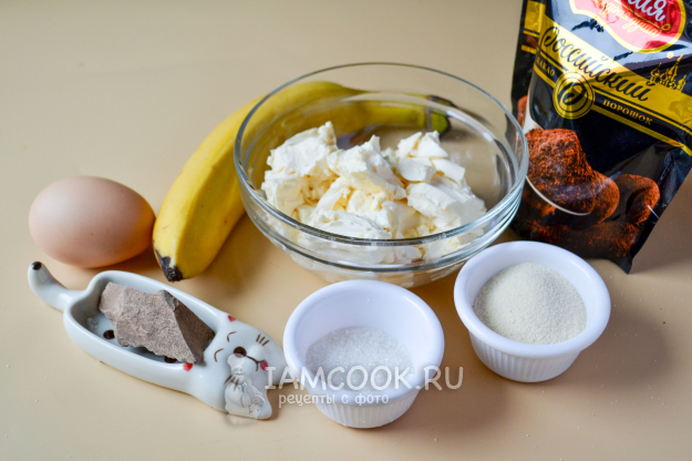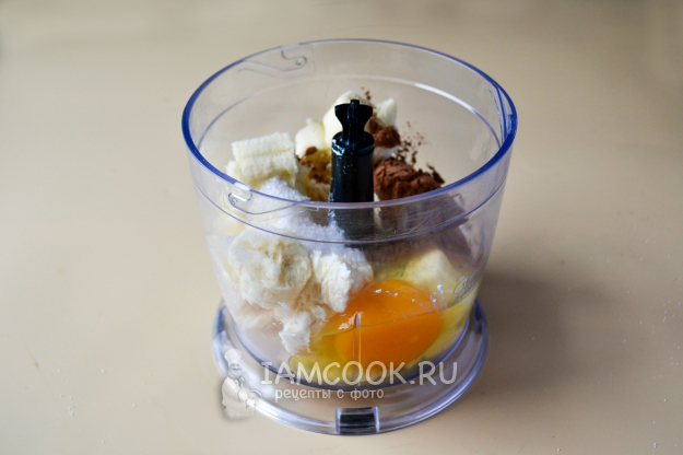 В чашу измельчителя положите творог, банан, поломанный на кусочки, разбейте яйцо, всыпьте сахар, какао-порошок и раскрошенный шоколад.