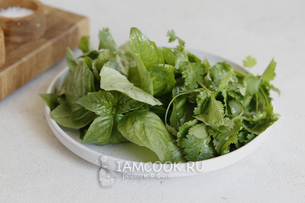 Зелень для этого соуса подойдет любая. Мне нравится сочетание базилика и кинзы, их я и добавила. Зелень тщательно промойте под проточной водой и высушите.