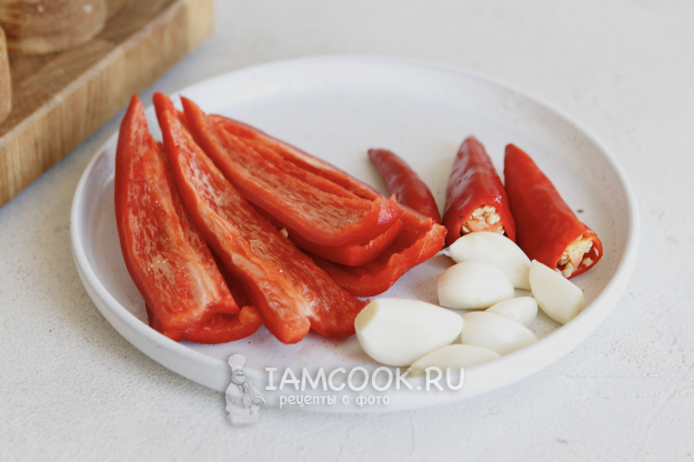 Почистите 7 крупных зубчиков чеснока. Болгарский перец очистите от семян. А вот у перца чили семена оставьте.
