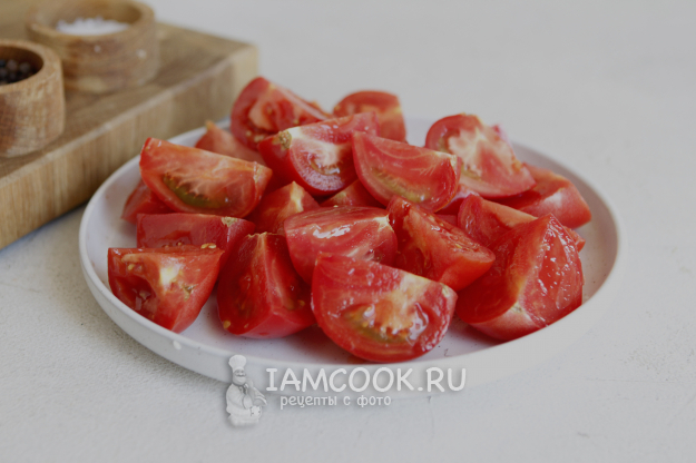 Подготовьте помидоры. Они должны быть спелыми, сочными, вкусными, не подпорченными. Промойте все овощи. Помидоры разрежьте на четыре части.
