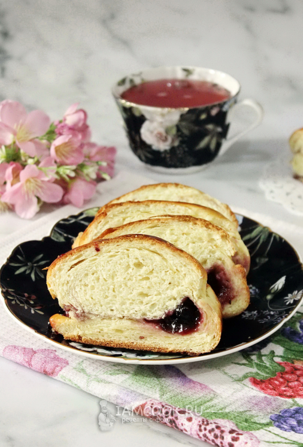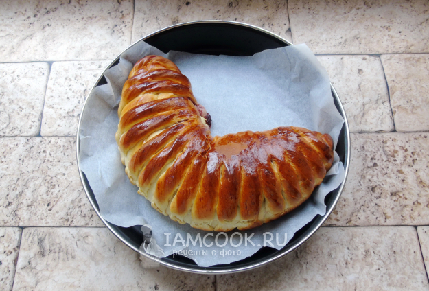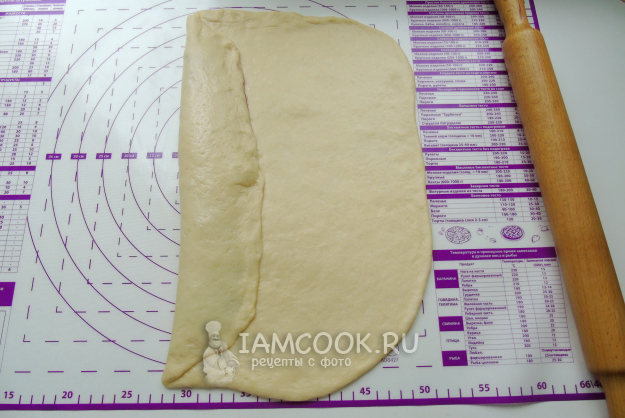Подошедшее тесто достаньте из миски и обомните. Затем раскатайте в прямоугольный пласт. На край пласта выложите начинку и накройте тестом, залепите края, как на фото.