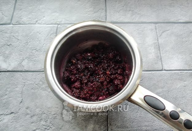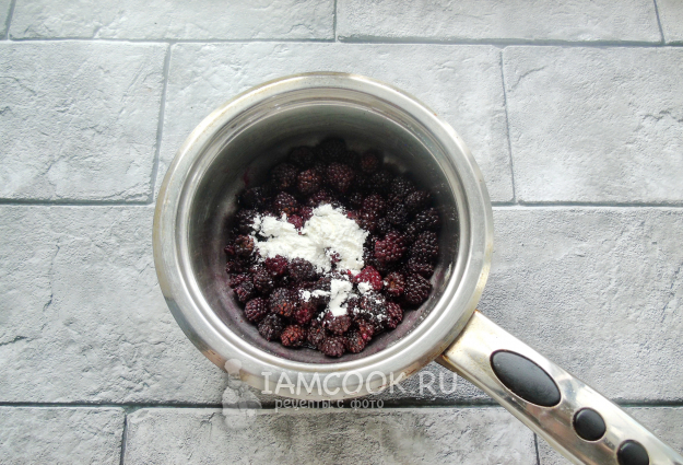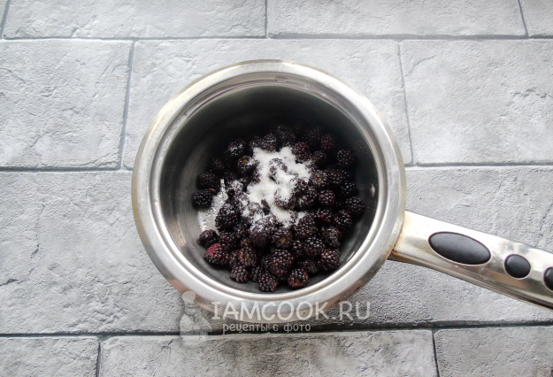 А пока тесто подходит, займитесь начинкой. Ежевику помойте и выложите в кастрюлю с толстым дном. Насыпьте сахар, перемешайте и нагревайте ягоды с сахаром до полного его растворения. При этом ежевика пустит сок.