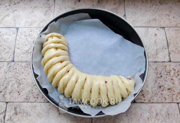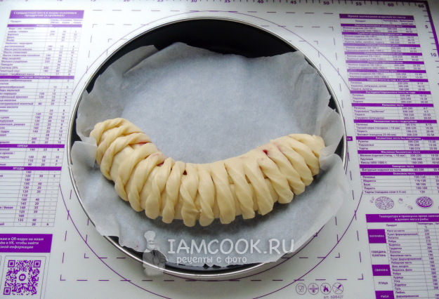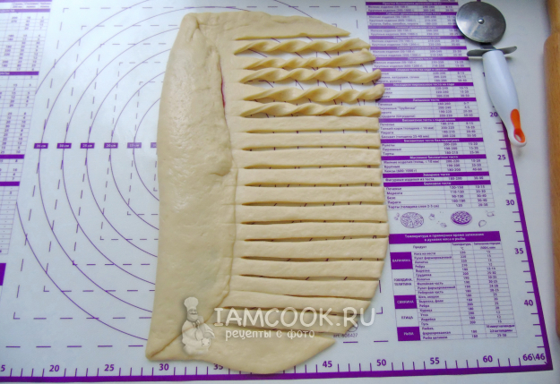 С помощью колесика нарежьте вторую половину пласта на полоски шириной 1-1,5 сантиметра. Каждую полоску закрутите по спирали.