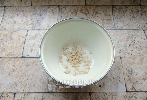 Дрожжи накрошите в миску. Свежие можно заменить сухими, их потребуется 5-6 граммов.