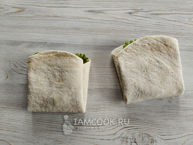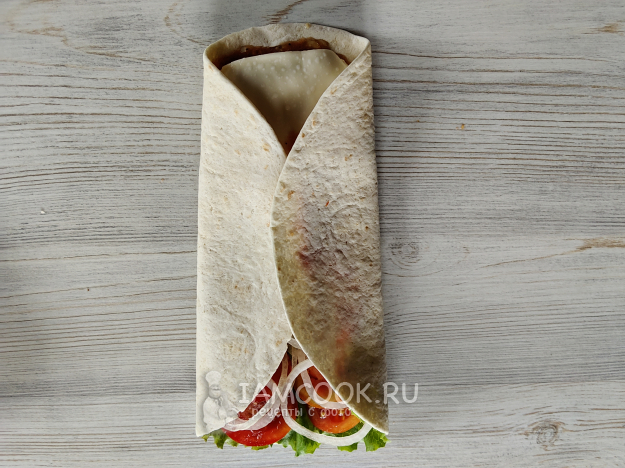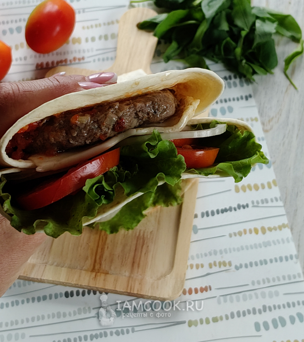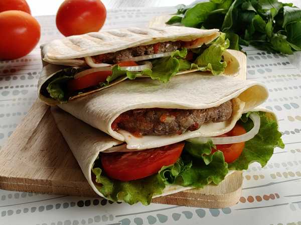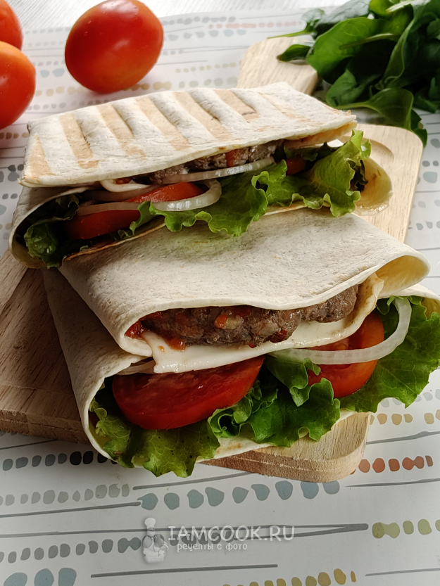 Бургер из тортильи с фаршем можно быстро подсушить на сковороде.