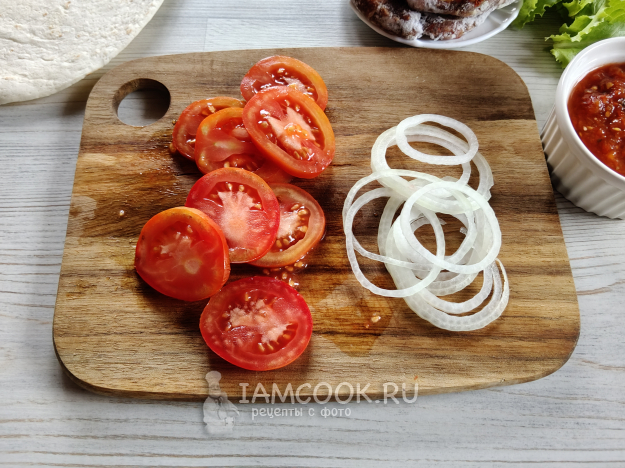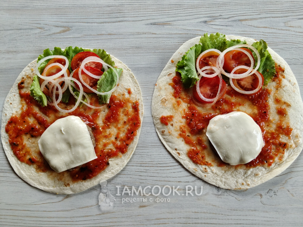 Разложить на один край, в центре листья салата, помидоры и лук, а на другую сторону - котлету с сыром.