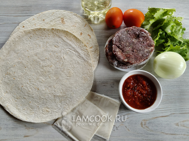 Возьмите необходимые ингредиенты для приготовления бургера из тортильи с фаршем на сковороде.