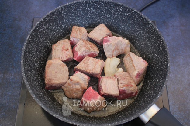 Обжарьте куски мяса со всех сторон на сильном, но не максимальном огне, чтобы они и запечатались, и приобрели вкусовую нотку, да и приготовление это действие тоже ускорит. Важно, чтобы мясо лежало в один слой, а времени потребуется около шести минут.