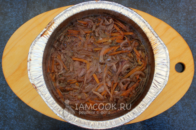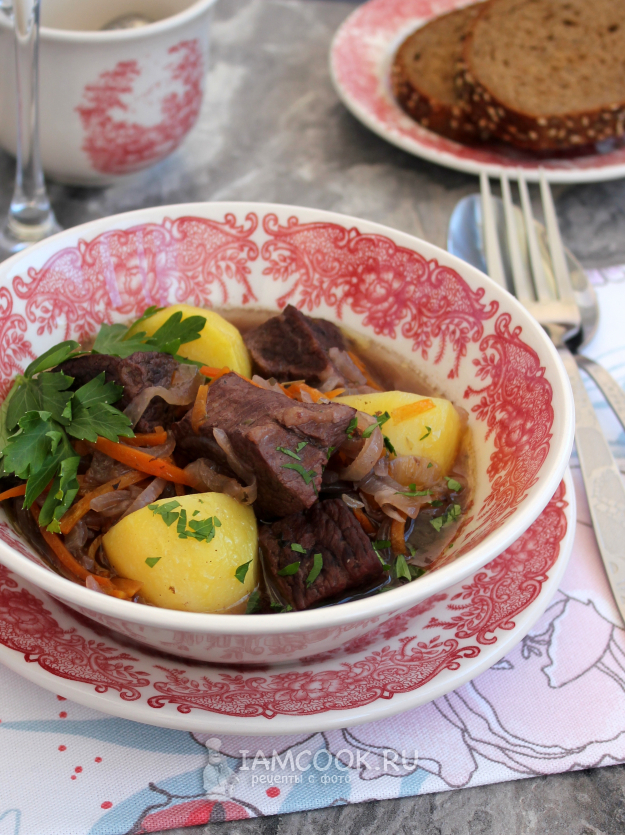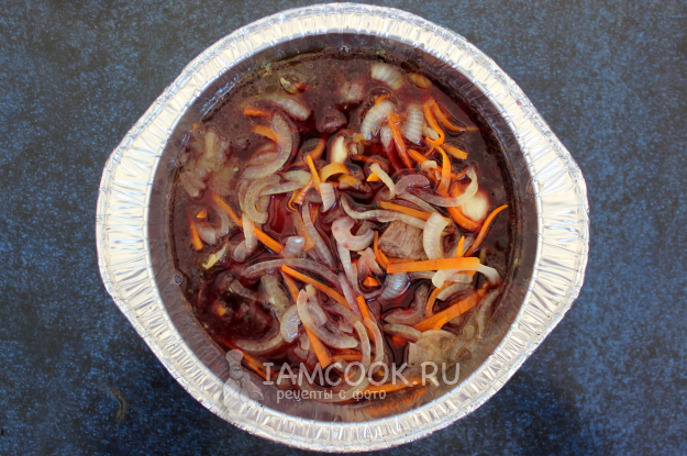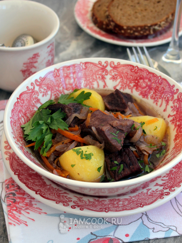 Закройте форму крышкой или фольгой и поместите в духовку. Оставьте небольшую щелку, чтобы чуток жидкости постепенно выкипало, кроме того, соус подзагустеет. Если мясо ещё не будет нужной приятной мягкости, то придется оставить всё это в духовке ещё на некоторое время (в зависимости от взятого мяса – до 3,5 часов…). Дайте огонь 160-180 градусов и проверьте готовность кусочка говядины через 1,5 часа. В моём случае мясо после 1,5 часов было ещё оставлено тушиться в духовке на 15 минут без крышки.