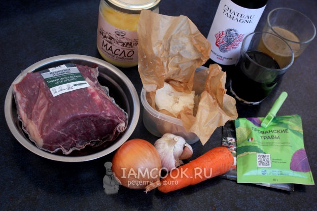 Для говядины по-бургундски подготовьте ингредиенты по списку к рецепту. Тут глазной мускул мраморной говядины, но подходит и другое филе, только точное время приготовления в любом случае указать проблематично.