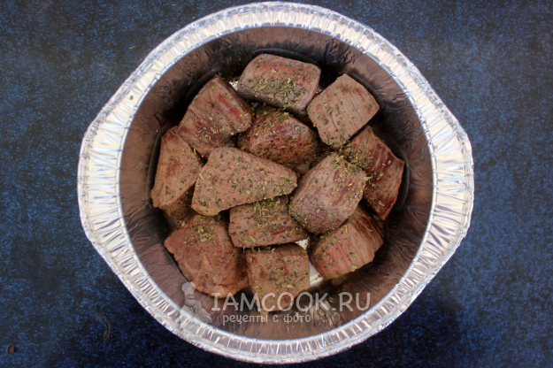 Переложите остаток сала и обжаренные куски мяса в форму для духовки, желательно с толстыми дном и стенками. Посыпьте специями, не солите, т.к. немного соли мясу уже досталось от сала.