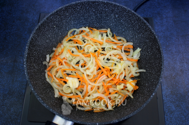 На сковороде на остатках масла обжарьте лук, чеснок и морковь при помешивании в течение 3-4 минут на среднем огне. Если масла покажется недостаточно, то добавьте ещё.