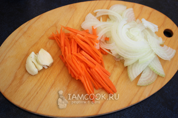 Морковь и лук тонко нашинкуйте. Зубчик чеснока раздавите широкой стороной ножа.