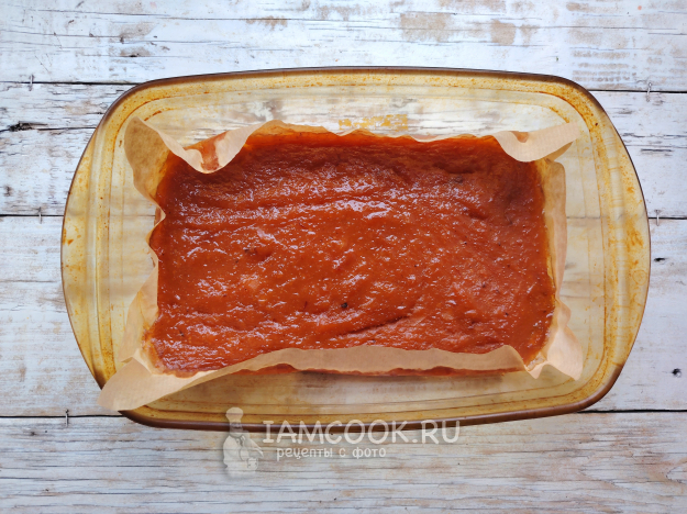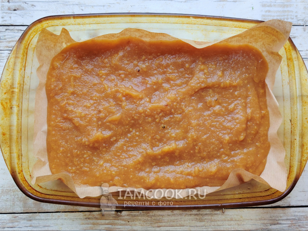 Затем яблочное пюре выложить в форму, застеленную пергаментом. Толщина слоя должна быть около 2,5 см. Отправить в духовку, прогретую до 100 градусов, и сушить его около 5-6 часов.