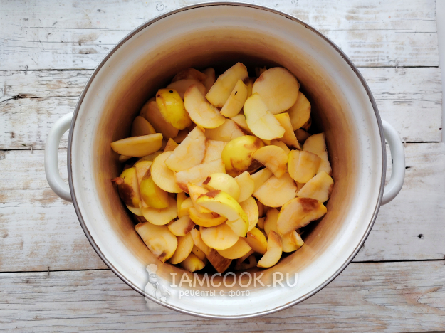 Яблоки помыть, нарезать хаотично, удаляя сердцевину с семенами. Кожицу снимать с фруктов не обязательно. Поместить яблочную нарезку в кастрюлю. Можно добавить немного сахара и оставить яблоки в кастрюле на ночь, чтобы они пустили сок. Но чтобы не ждать, можно влить немного воды и поставить кастрюлю на медленный огонь.