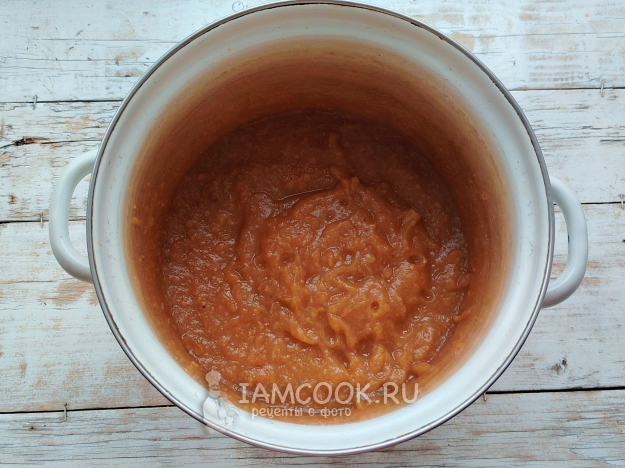 Пробить яблочную массу погружным блендером до состояния пюре. Поварить яблочное пюре на медленном огне в течение получаса, но нужно обязательно следить за его варкой, часто помешивать, иначе оно может пригореть к дну кастрюли.