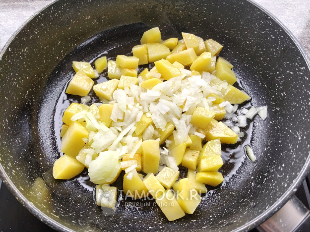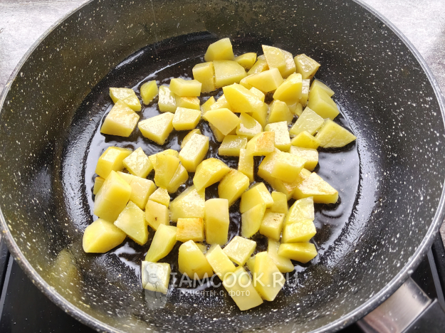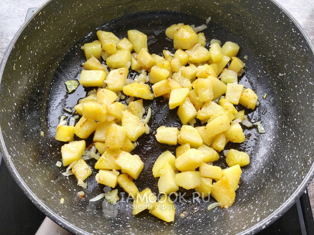 Жарить всё вместе, помешивая, на среднем огне, пока картофель не станет мягким.