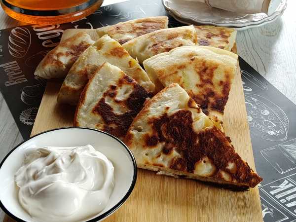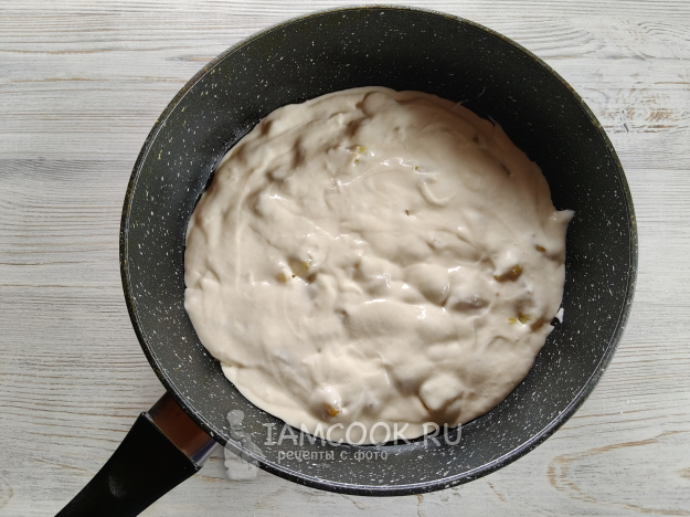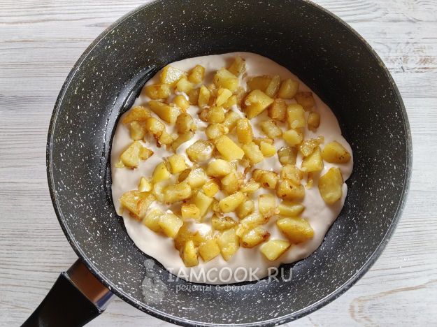 Готовить заливной пирог с картошкой на сковороде, пока низ не подрумянится, верх тоже заметно пропекается.