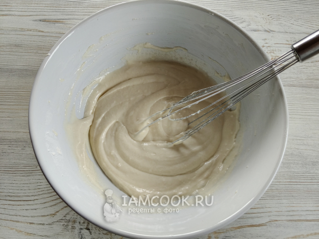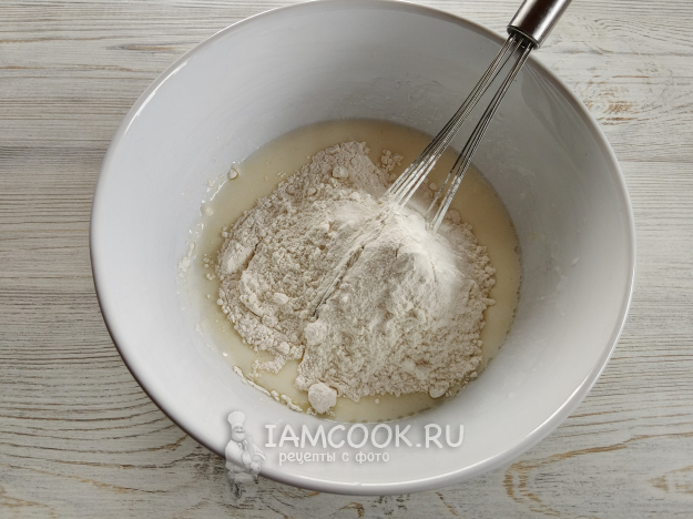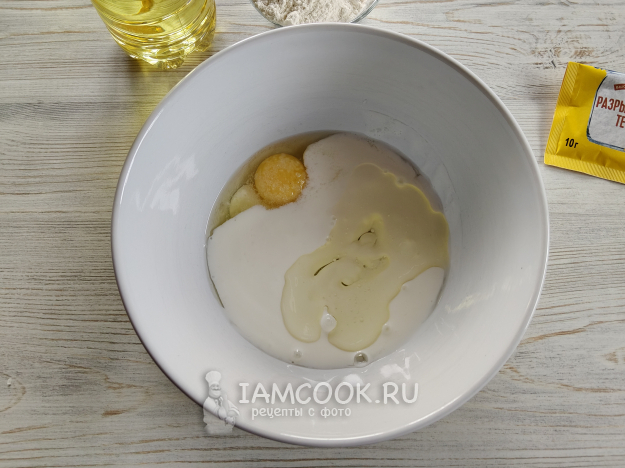 В миску разбить яйцо, влить кефир, масло, добавить соль и сахар.