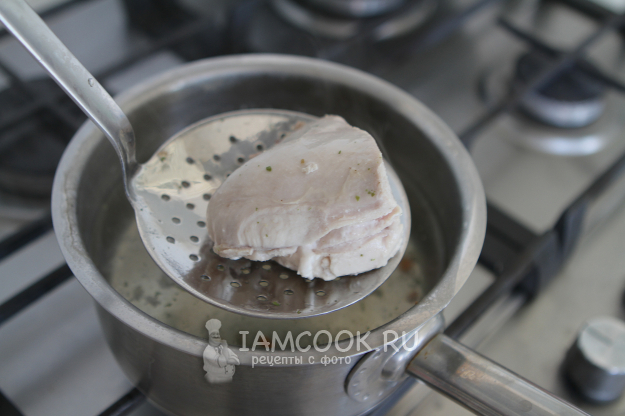 Сполосните куриную грудку под проточной водой, переложите в кастрюлю и влейте воду. Доведите до кипения, снимите пенку. Добавьте пару горошин черного перца, лавровый лист, слегка посолите. Варите под крышкой на умеренном огне 25-30 минут.